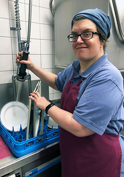 Carmen Fischer hat nach der Förderschule eine Hauswirtschaftsausbildung absolviert und danach 17 Jahre bei Putzblitz gearbeitet – dem Gebäudereinigungsbetrieb der cba. Seit Mai 2022 ist sie jetzt schon hier in der Kantine. Was sie nach ihrer Zeit als Reinigungskraft vor allem genießt, sind die moderaten Arbeitszeiten. „Die Büros, die wir geputzt haben, mussten meistens bis 6.30 Uhr sauber und fertig sein – da bin ich immer wirklich früh aufgestanden. Jetzt in der Kantine ist es schon viel angenehmer“, sagt Fischer und lächelt.