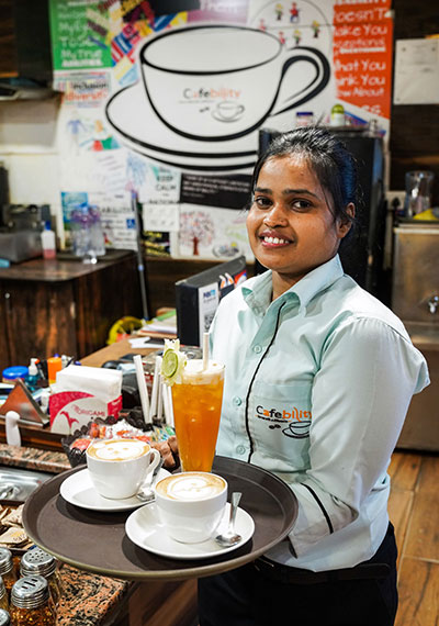 Reedu Patel hat im Cafebility die englische Sprache gelernt und eine professionelle Barista-Ausbildung absolviert. Inzwischen hätte sie auch gute Chancen, wenn sie sich in einem herkömmlichen Restaurant bewerben würde, schätzt die junge Frau. „Aber warum wechseln, wenn es hier so gut ist“, sagt sie lächelnd. Sie mag das Konzept, dass alle akzeptiert werden, so wie sie sind. An den Wänden des Cafés werben Plakate für Diversität.