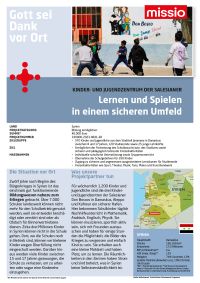 Wir übermitteln Ihre Spende an unsere Projektpartner in Syrien: Mit den Spenden aus der Aktion an Ihrer Schule werden benachteiligte Jugendliche unterstützt, die z. B. im Don-Bosco-Zentrum in Damaskus Sport- und Freizeitangebote erhalten und dadurch ihren Wert und ein Gemeinschaftsgefühl erfahren können.